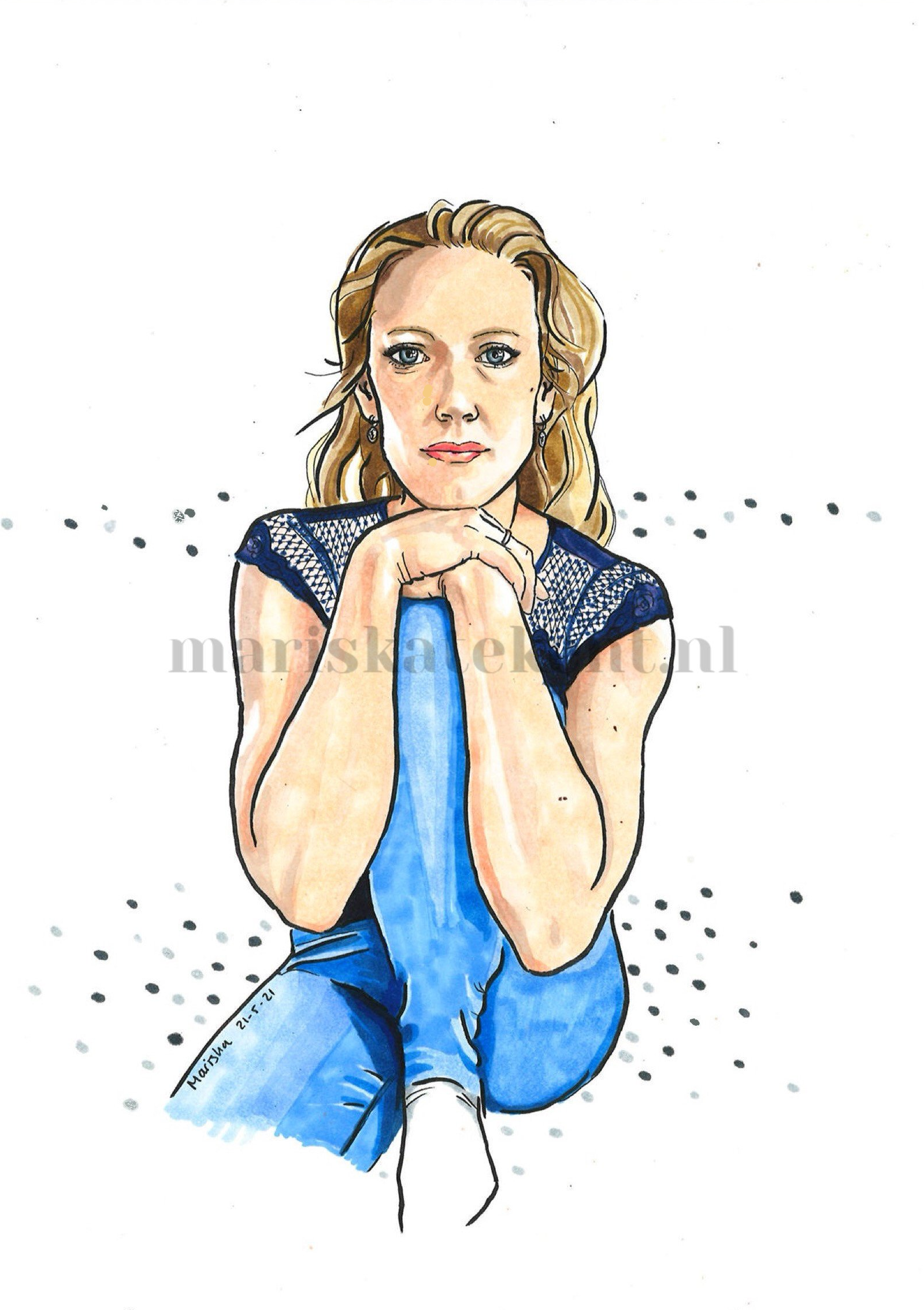Het werkt gek, maar als ik geen inspiratie heb, bevalt het maken van een zelfportret me prima. Nadat ik het tekenende zelfportret gemaakt had, heb ik een tijdje geen zin of tijd gehad om weer te tekenen. Ik vond het wel een prettige gedachte dat mijn zelfportret in elk geval nog aan het tekenen was...